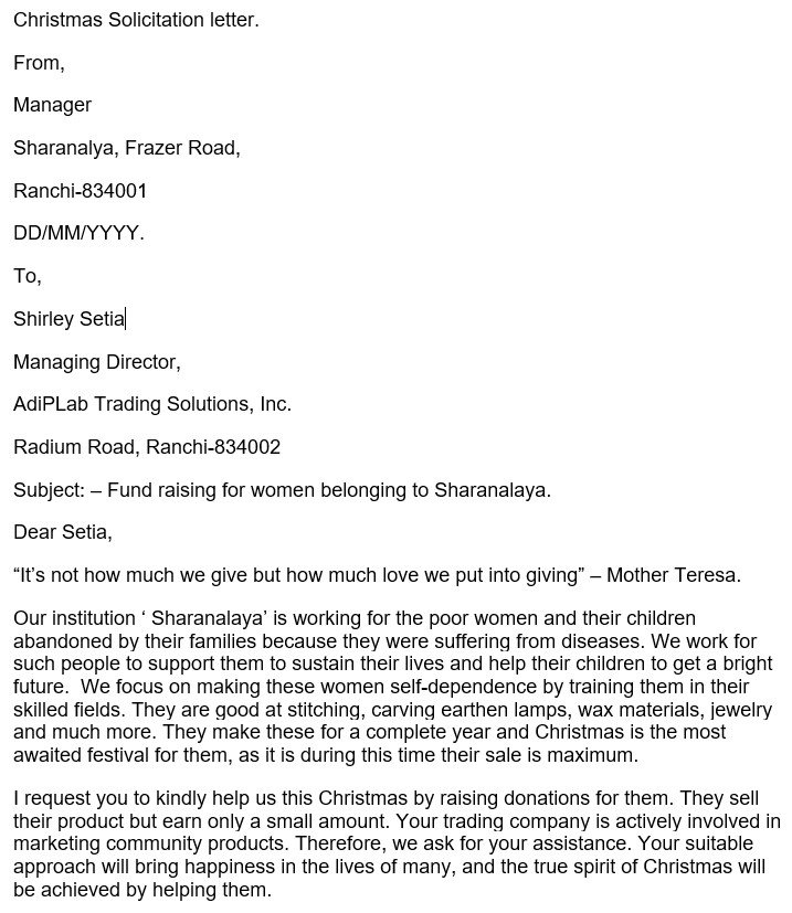 A solicitation letter is a formal or semi-formal letter written to request help, support, or contribution from a person, company, business, or organization.