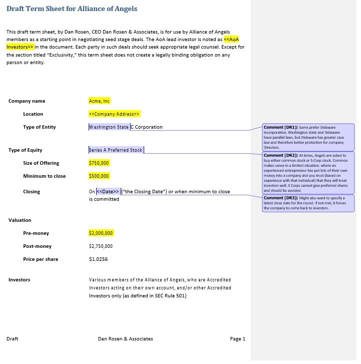 draft term sheet for alliance of angels