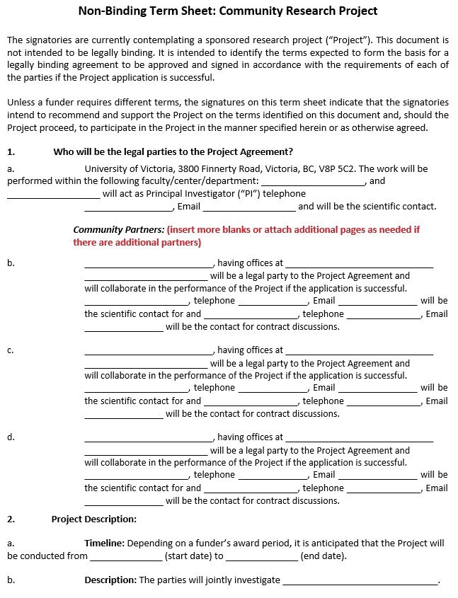 non binding term sheet community research project template