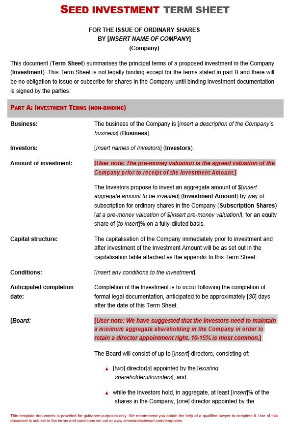 seed investment term sheet template