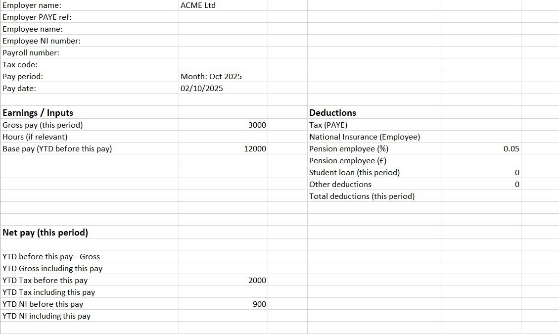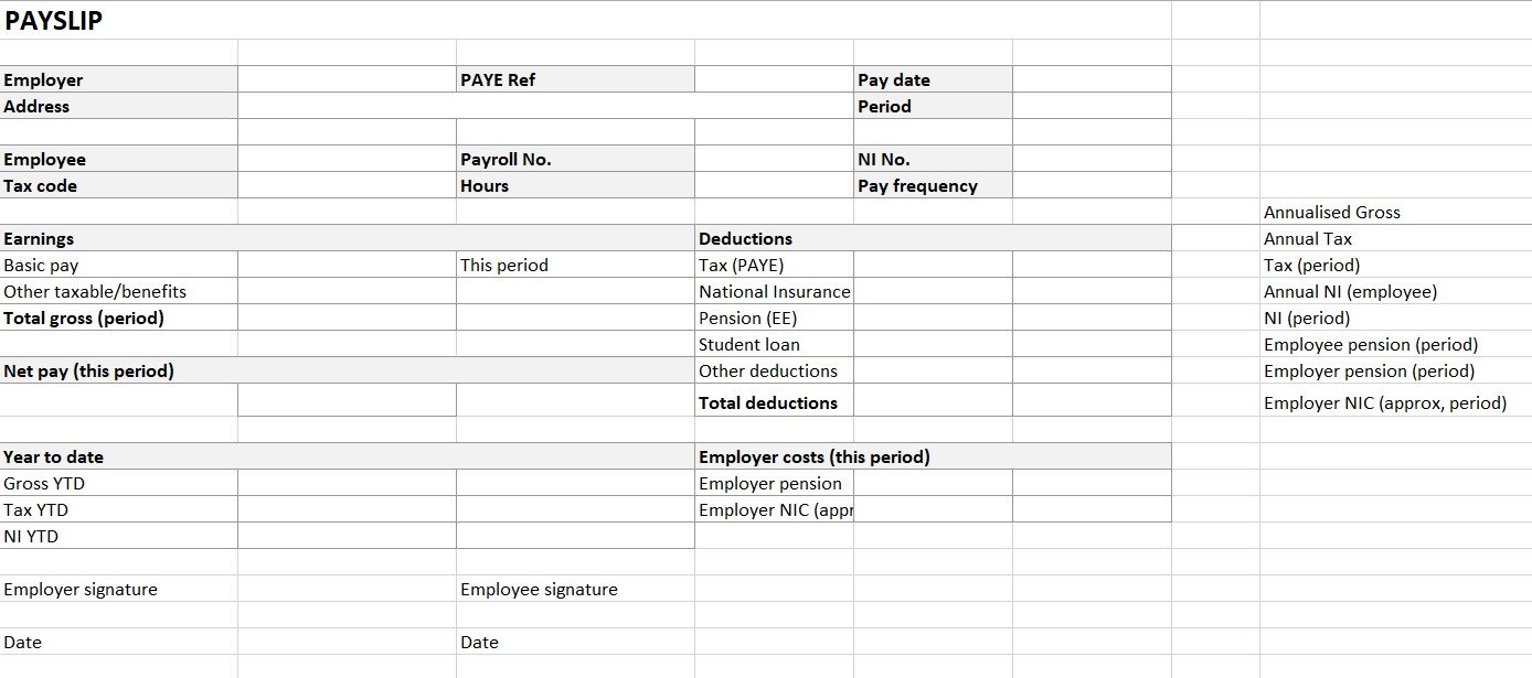 - (Recommended) Year-to-date (YTD) totals for gross, tax, NI, pension
